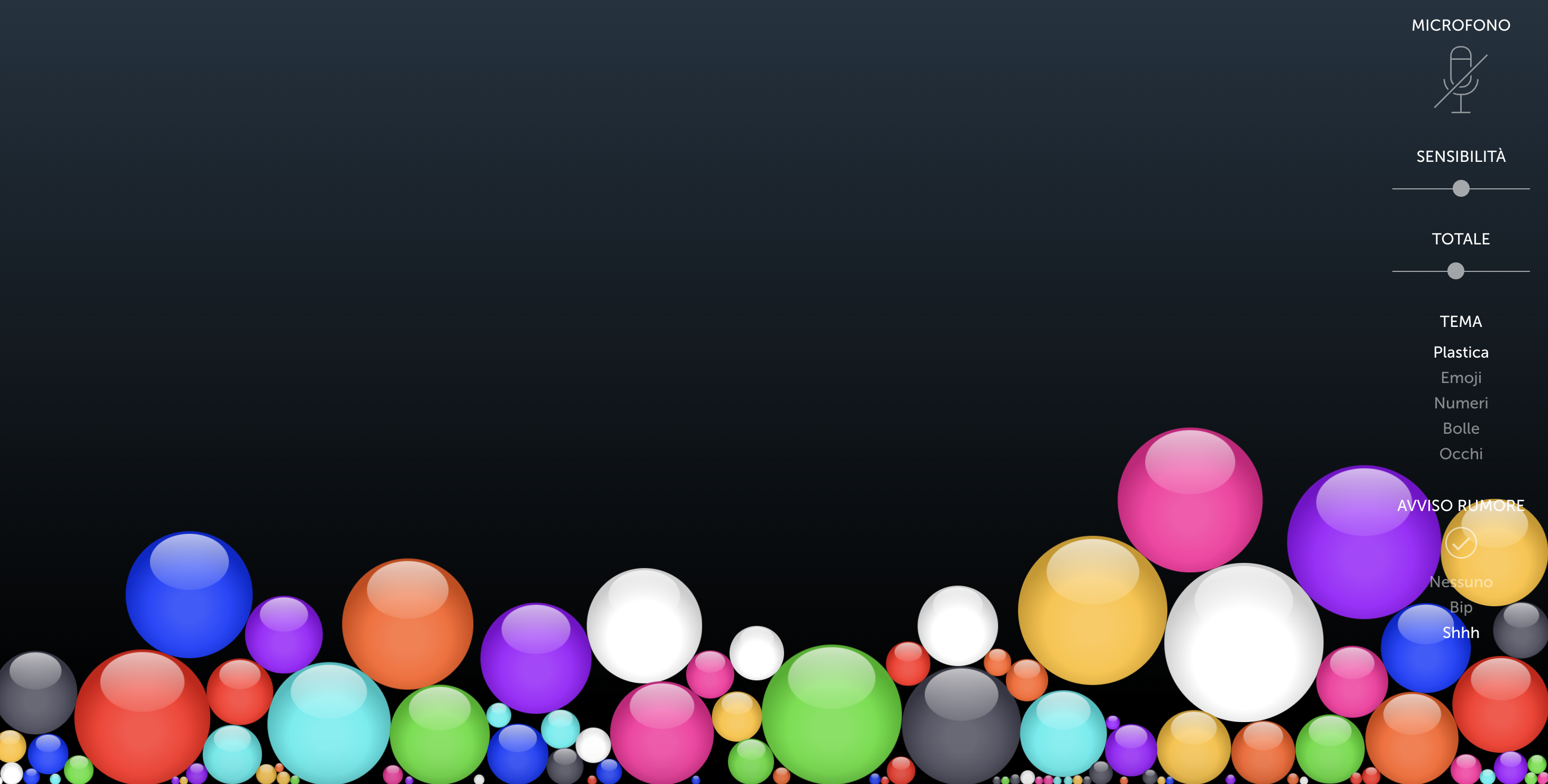 Bouncy Balls è un’applicazione divertente e interattiva per il controllo del rumore in classe alla LIM. Visualizza sfere animate che reagiscono al livello di rumore, aiutando gli studenti a monitorare e regolare il proprio volume, promuovendo un ambiente di apprendimento tranquillo e produttivo.